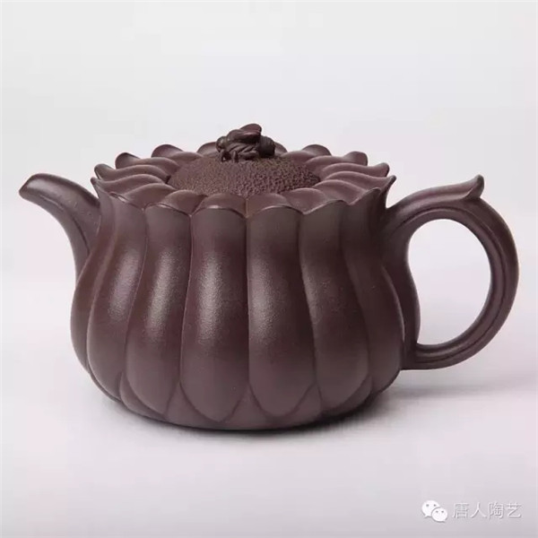 第一件,《蜂菊壺》取材于大自然蜜蜂采蜜之情形,立意新穎。壺身等分成十六瓣,俯視如盛開的菊花,蓋為花蕊,壺鈕設計成正在花蕊上采蜜的蜜蜂。顯得靜中有動,生機盎然,側視該壺,筋囊飽滿凝重,通體線條流暢,大氣中不乏精巧。菊花與蜜蜂肖形逼真,洋溢著大自然的和諧情趣。據(jù)說,唐朝霞老師為制作此壺,多次徘徊在桃花林里、菊花叢中,觀察蜜蜂的神態(tài),巧妙地讓蜜蜂造型躍然“蜂菊壺”壺鈕上,靜中寓動,令人叫絕。