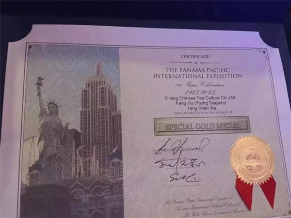 據(jù)悉,此次在美國舉行的巴拿馬太平洋萬國博覽會百年慶大會上,共有來自全球30多個國家5000個品種參展,盛況空前,共評出3個特等獎、10個金獎以及銀獎、銅獎、優(yōu)秀獎若干。唐朝霞的作品能夠獲得兩項大獎,無疑是宜興紫砂的杰出代表。百年之前的1915年,宜興紫砂在首屆巴拿馬太平洋萬國博覽會上也曾讓世界為之傾倒,程壽珍的“掇球壺”、范大生的“大柿子壺”獲頭等獎。1933年,在美國芝加哥萬國博覽會上,宜興紫砂再次轟動世界,范大生的“合棱壺”、俞國良的“四方傳爐壺”、汪寶根的“東坡壺”、朱可心的“竹節(jié)鼎”喜獲金獎。國人眾所周知,茅臺酒是榮獲巴拿馬萬國博覽會金獎一舉成名的,而今,宜興唐朝霞的《蜂菊》壺獲得本次活動的特別金獎、《丹鳳朝陽》壺獲得金獎,喻示著:唐朝霞的作品不僅走出了宜興、走到深圳,還走出了國門、走向了全世界!