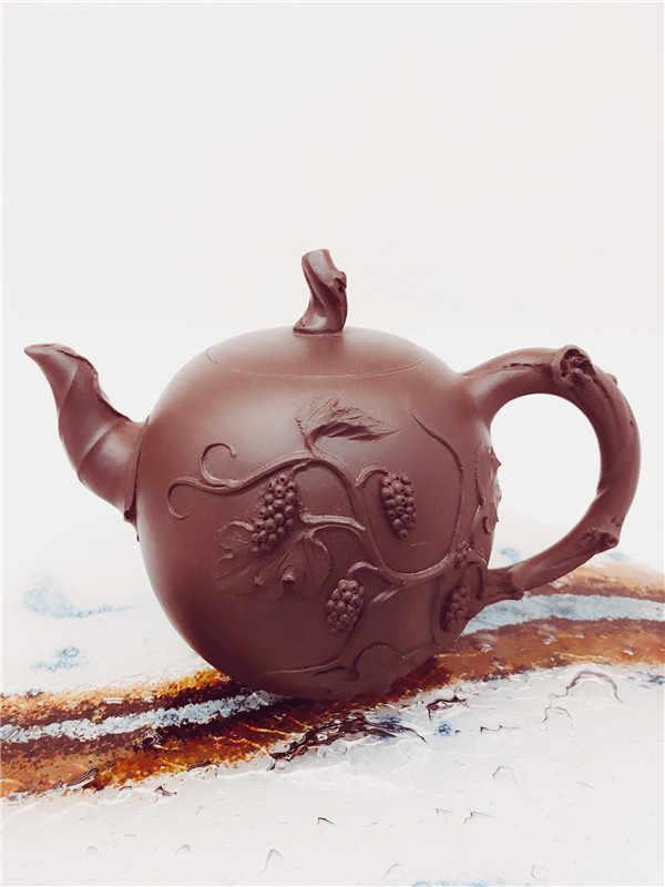 第二件,《碩果累累壺》的壺身為一顆碩大成熟的葡萄,壺把,壺嘴及壺鈕是以葡萄枝葉,葉蔓自枝干引向壺體,綴以累累的果實,整體飽滿壯碩,情趣盎然。