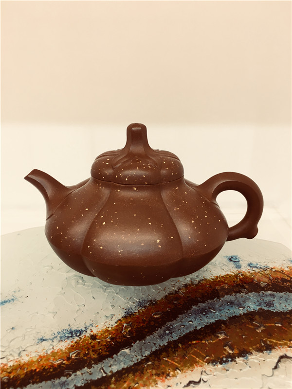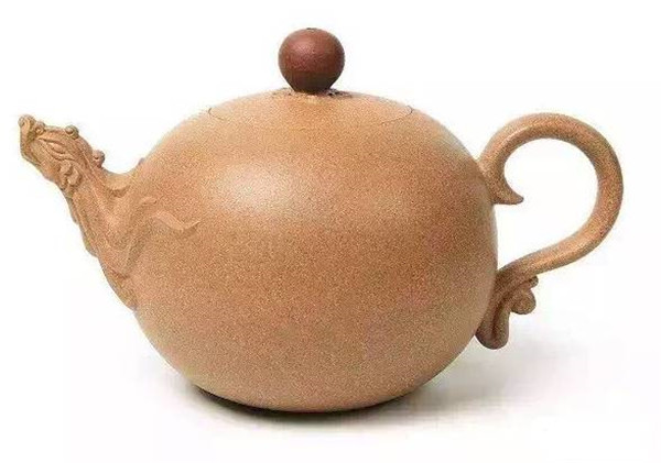 第三件,《丹鳳朝陽壺》以鳳首為壺流,祥云做壺把,鳳凰昂首鳴唱,振羽欲飛,其線條婉轉,儀態(tài)優(yōu)美,肖形傳神,壺身圓潤飽滿。泥料精心選配梨皮砂,色澤金黃,質感豐富,壺鈕泥色變化為朱色,仿佛一輪朝陽在金色的云霞中一躍而出,帶出一片光明。此壺寓意丹鳳呈祥,有完美、吉祥、和諧之涵意。