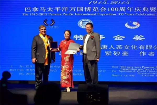 2015年底,巴拿馬太平洋萬國博覽會在美國拉斯維加斯舉行,唐朝霞選送參展的“蜂菊壺”榮獲特別金獎,她也因此成為新中國成立以來唯一獲此國際大獎的女性紫砂藝術家。