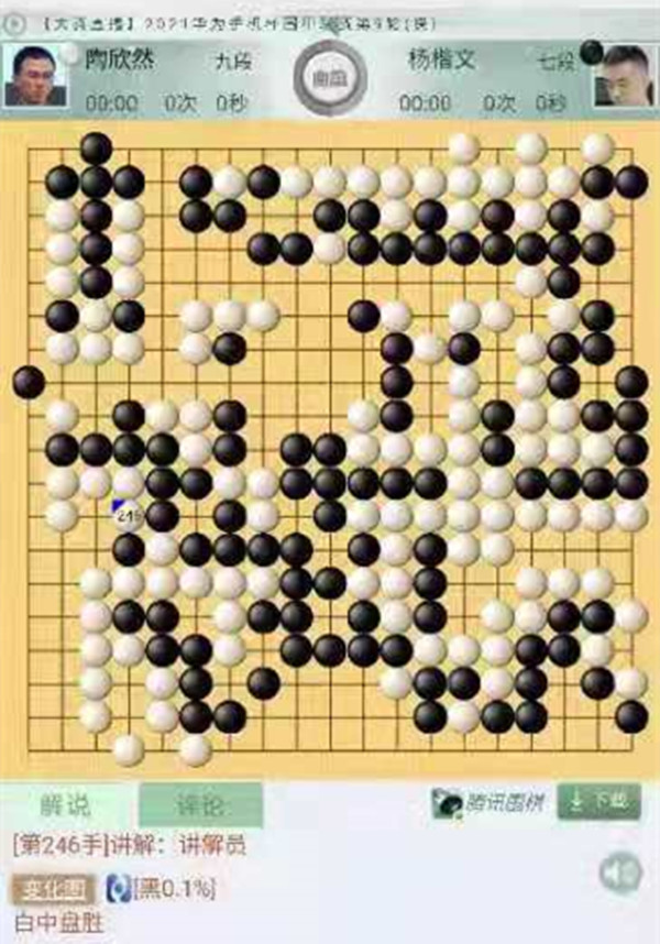 三臺(tái)陶欣然執(zhí)白對(duì)陣等級(jí)分排名29位的楊楷文。開(kāi)局右邊黑棋沖擊白棋將白分?jǐn)啵怯捎谄逍螞](méi)有下對(duì),反而用來(lái)斷開(kāi)白棋的棋筋被吃,白棋早早進(jìn)入勝勢(shì)。這一盤(pán)是此輪深圳龍華隊(duì)唯一勝局,不易!為陶欣然點(diǎn)贊!
