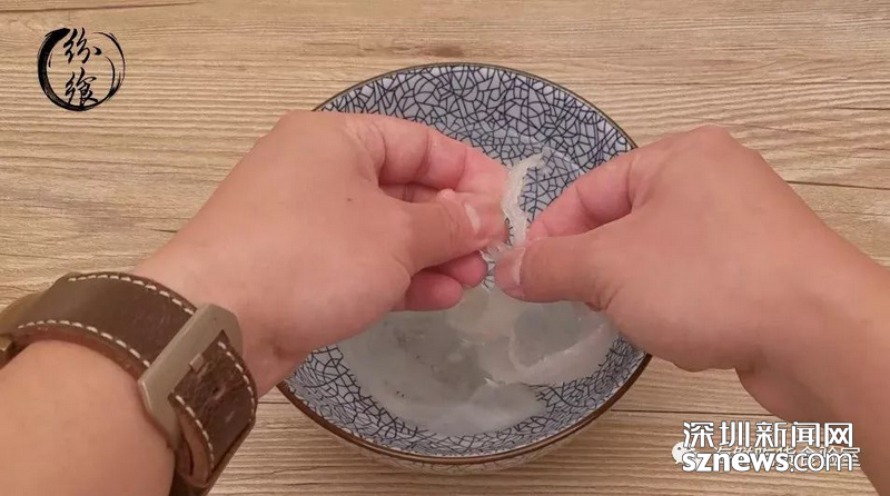 浸泡1~2小時(shí)左右的時(shí)候,燕窩變軟了。將燕窩撕成條狀繼續(xù)浸泡(這樣有助于燕窩更好的泡發(fā))。