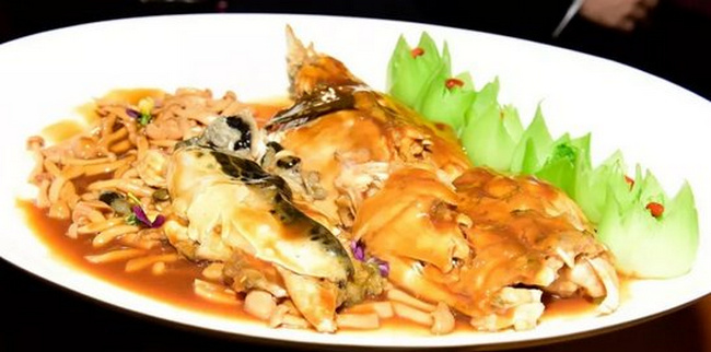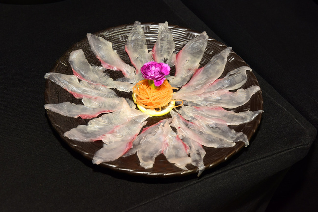 本次品鑒會(huì)晚宴以富谷紅鰭東方鲀?yōu)橹黝},共呈現(xiàn)了七道河豚及相關(guān)產(chǎn)品菜品:包括:紅燒河豚、白汁河豚、白溜河豚魚片、紅燒海參靈芝菇、河豚魚皮絲、河豚魚丸湯、河豚魚水餃等,與會(huì)嘉賓共同品鑒,對(duì)河豚食材鮮美贊不絕口。(常軍平)