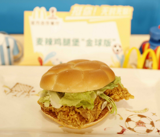 麥當勞中國最受歡迎的漢堡單品——麥辣雞腿漢堡,在FIFA世界杯期間搖身一變“金球版”,蓋上足球形狀堡頂,F(xiàn)IFA世界杯期間10元限時特價