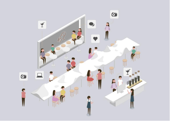 桌面上不規(guī)則隆起的山丘,則在功能區(qū)上區(qū)隔了不同的茶客,小山丘自然的讓人們選擇適合自己需求活動(dòng)的區(qū)域,這也是多種社交方式并存的明證:在喜茶的空間里,你可以“一人小憩”,或“三兩成群”,或“選擇相遇”。