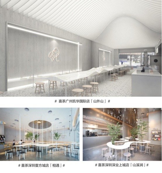 店中的桌子做成浮云形狀,山成為桌子的一部分,與天頂?shù)纳叫伟咨⌒雾斉镞b相呼應(yīng),“山外山”主題呼之欲出。喜茶·山外山的設(shè)計(jì)靈感來(lái)源于兩幅古畫——《春山瑞松圖》和《溪山行旅》。設(shè)計(jì)師把畫中的“山峰”感融入店內(nèi),現(xiàn)代化的同時(shí)富有詩(shī)意。讓茶客仿佛置身畫中,大夢(mèng)一場(chǎng),不知身在何方。