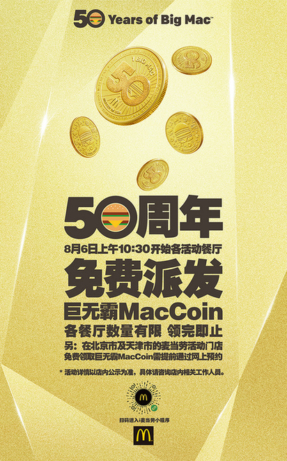為了與中國(guó)消費(fèi)者一起歡慶巨無(wú)霸50周年,中國(guó)內(nèi)地指定麥當(dāng)勞餐廳將于2018年8月6日當(dāng)日免費(fèi)送出超過(guò)100萬(wàn)枚MacCoin。早上10:30開(kāi)始,顧客前往餐廳為巨無(wú)霸唱出生日歌[ 北京市和天津市的顧客需2018年8月4日上午9:00起在“i麥當(dāng)勞”微信小程序提前預(yù)約,方可于8月6日10:30起在指定麥當(dāng)勞餐廳領(lǐng)取。],即可獲得MacCoin一枚,圖案隨機(jī),送完即止。北京市和天津市的顧客需2018年8月4日上午9:00起在“i麥當(dāng)勞”微信小程序提前預(yù)約,方可于8月6日10:30起在指定麥當(dāng)勞餐廳領(lǐng)取。顧客可以分享與收藏,也可以在2018年12月31日前憑MacCoin在中國(guó)內(nèi)地、美國(guó)、荷蘭、新西蘭、巴西等全球超過(guò)50個(gè)國(guó)家和地區(qū)參與活動(dòng)的麥當(dāng)勞餐廳,免費(fèi)兌換巨無(wú)霸一個(gè)。