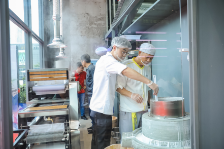 一般的越南河粉店用的是進口貨,就算來源再好,在運輸過程中總有味道和韌度的流失。傳統(tǒng)河粉機屬于大型設備,蔡瀾團隊經過22個月的研發(fā)和改良,縮小尺寸才能將機器陳列于餐廳,讓顧客見證新鮮河粉生產制作的全過程:大米浸泡至軟,石磨磨成米漿再蒸熟、切割成河粉,用心打造出一碗新鮮美味的Pho。