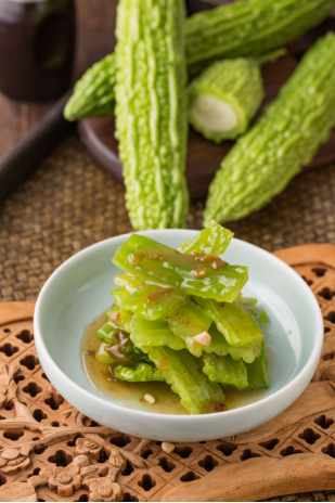 苦瓜又叫涼瓜,滌熱,明目,清心。通過冰鎮(zhèn)使苦瓜呈青翠瑩亮的半透明狀,青梅腌制的醬,降低了苦瓜的苦度,調(diào)和出酸甜適口、清涼甘苦的滋味。