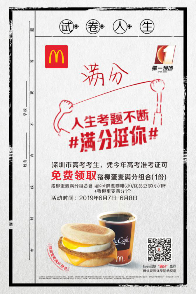 麥當(dāng)勞早餐攜手百萬網(wǎng)友,預(yù)祝高考考生“滿分”考試,以“滿分”的早餐,迎接每天“滿分”生活。