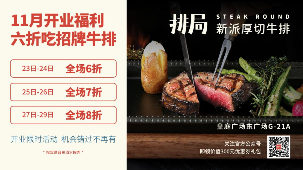 排局·新派厚切牛排為了慶賀開業(yè),也為消費(fèi)者們帶來了勁爆的開業(yè)福利——11月23日至24日兩天全場(chǎng)6折,11月25日至26日兩天全場(chǎng)7折,11月27日至29日三天全場(chǎng)8折。另外搜索“排局”關(guān)注官方公眾號(hào),即可免費(fèi)領(lǐng)取價(jià)值300元優(yōu)惠券禮包。
