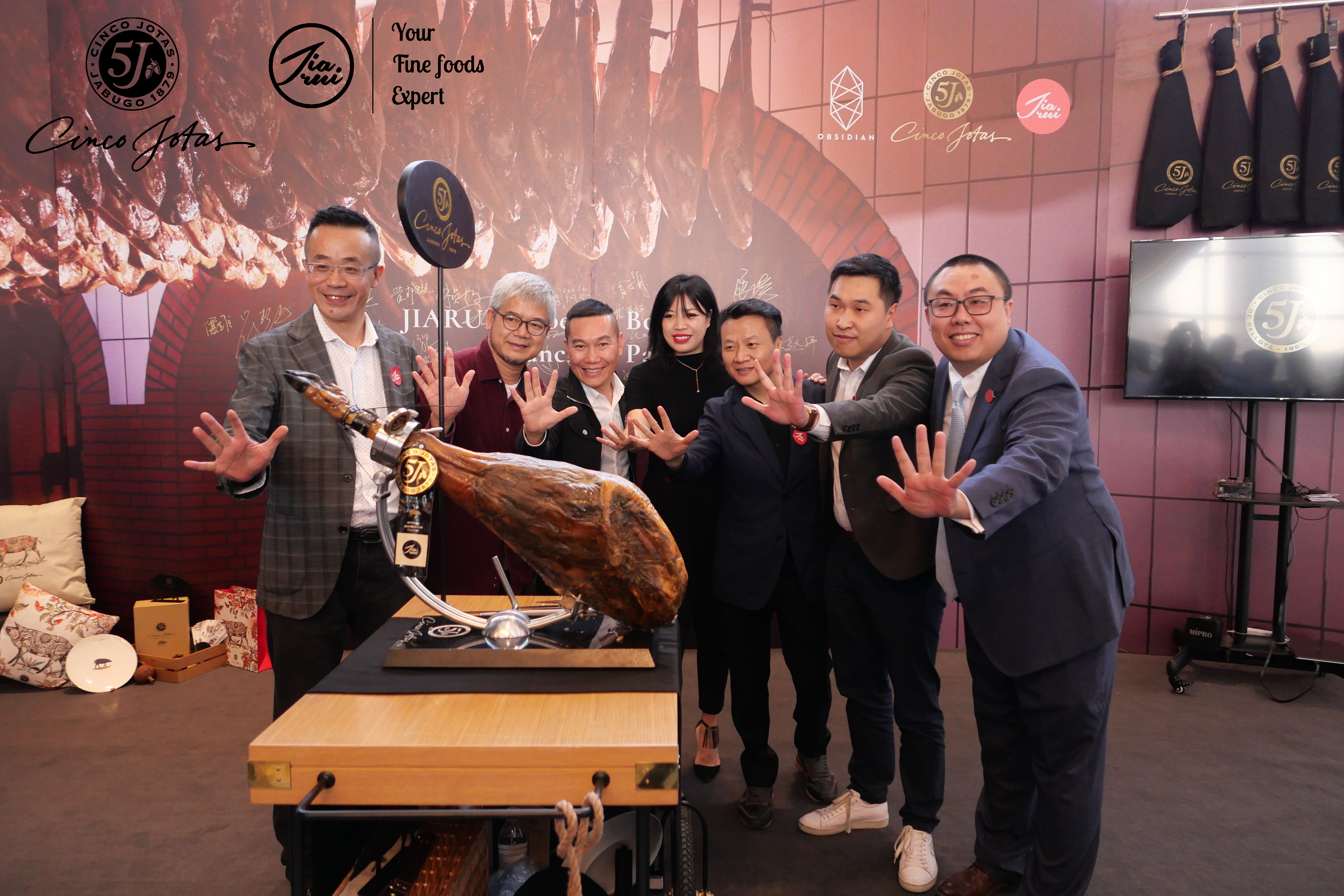 11月28日,深圳佳銳食品有限公司攜手OBSIDIAN BAR和5J品牌在深圳的地標(biāo)-平安金融中心舉行隆重的5j帶骨火腿開關(guān)揭幕儀式;5J的大中華區(qū)銷售總監(jiān)-Selina、深圳佳銳總經(jīng)理-趙斌、OBSIDIAN BAR老板-程子瑞、深圳烹飪協(xié)會(huì)-劉永忠副會(huì)長(zhǎng)、蠔門九式創(chuàng)始人-陳漢宗和潮汕美食達(dá)人-林貞標(biāo)一起為南區(qū)第一條帶骨5j火腿做揭幕。