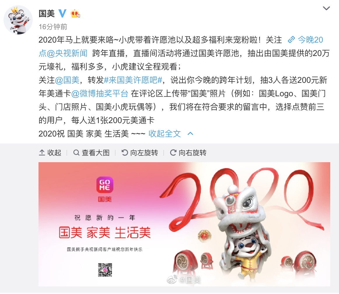 跨年就是要大聲說出你的心愿,趕快@國美幫你圓夢(mèng)。活動(dòng)當(dāng)天,國美官方微博將與央視新聞同步抽獎(jiǎng),2019年12月31日17點(diǎn)起至2020年1月1日不同時(shí)間段抽取多項(xiàng)大獎(jiǎng),其中最高獎(jiǎng)項(xiàng)為價(jià)值2020元國美美通卡1張。