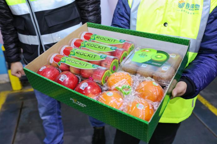 精美水果禮盒內(nèi)含愛(ài)妃蘋(píng)果、樂(lè)淇蘋(píng)果、佳沛奇異果和農(nóng)夫山泉17.5°橙。