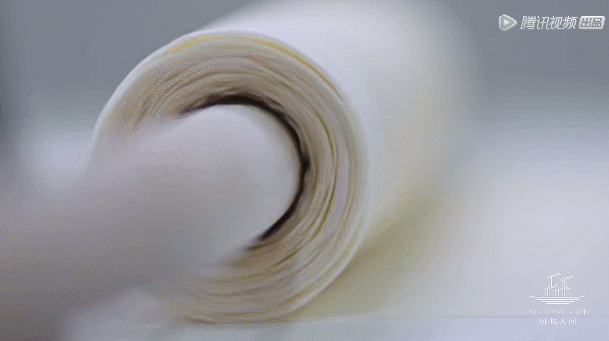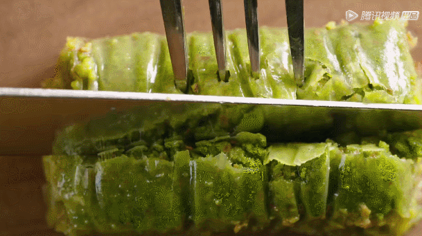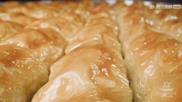 奶酪加滿滿的開(kāi)心果碎,上下覆蓋二十層薄如蟬翼的面皮,小伙子苦苦練習(xí)七年搟面皮,十幾張面皮同時(shí)搟壓,每張的厚度不超過(guò)0.1毫米,