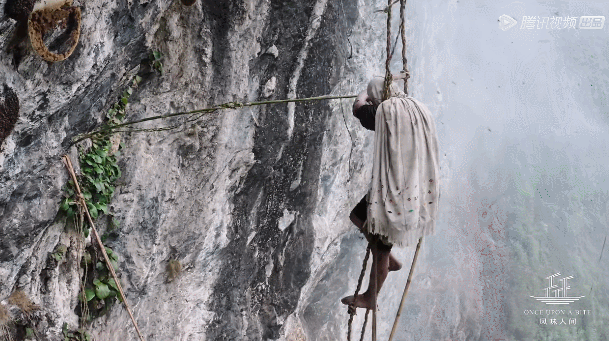 上百米的懸崖,工具卻再簡(jiǎn)單不過(guò)。獵人點(diǎn)燃枝葉對(duì)抗喜馬拉雅巨蜂,還要小心不能讓火引燃藤梯。