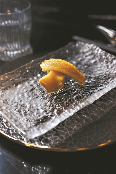 湯焯乃雞油焯響螺。1斤1只的響螺去殼與頭后,凈肉僅僅2兩。切成片狀的響螺經(jīng)過定時低溫慢煮后,淋上剛剛滾起的熱雞油,上碟時,它旁邊跟著一灘其貌不揚的醬汁,那便是紫蘇醬。響螺配紫蘇,勾起人們對中秋的紫蘇炒田螺的味覺記憶。油焯的風味靈感源自蒜香骨這道傳統(tǒng)粵菜,取蒜香味結合魚露醬,融入花膠天婦羅之中。將花膠以天婦羅的方式展現(xiàn),這也是大膽的嘗試。味焯的做法則讓人更熟悉,立馬想起前些年風靡廣州的鹵水火鍋來。獅頭鵝的鵝肝在鹵水里泡著溫泉,時間一到才起身,并不太咸,香濃恰好。還有汽焯,是用最當造的大黃花魚,將整個迷你小蒸籠搬到面前來,現(xiàn)蒸現(xiàn)吃,7分鐘,嫩度正好。火焯則是燒烤澳大利亞和牛肉的燒烤方式,這最原始的烹飪方式里夾著迷迭香和百里香的誘人香氣。而這每一道菜肴,僅僅數(shù)口的分量,道道位上,分量恰到好處,避免了餐桌上的浪費。