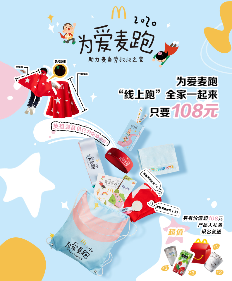 不同于往年大規(guī)模的線下親子跑,今年“為愛麥跑”采用創(chuàng)新的“線上愛心親子跑”,提供裝備包和任務(wù)盒,讓參跑家庭用不聚集、無接觸的形式參與跑步,享受親子時(shí)光,并支持麥當(dāng)勞叔叔之家?!盀閻埯溑堋惫膭?lì)參跑者發(fā)揮創(chuàng)意,以家庭為單位設(shè)定自己的路線和距離,例如以自己的家為起點(diǎn),將終點(diǎn)設(shè)在附近的麥當(dāng)勞餐廳。