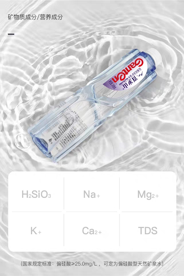 經(jīng)小編了解,百歲山天然礦泉水是采自于地下深層巖石裂隙中,從不使用湖水、河水、水庫水等地表水。而且,百歲山的礦泉水源具有《采礦許可證》,屬于國家液體礦產(chǎn),如同金礦銀礦。一經(jīng)開采可直接飲用,水源天然無污染,還含有高偏硅酸,以及鉀、鈉、鈣、鎂等豐富礦物質及微量元素。正因為這樣優(yōu)質珍貴的礦泉水源,才成就了水中貴族獨一無二的品質。