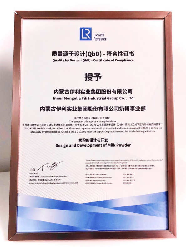 伊利獲頒食品行業(yè)首個QbD認證