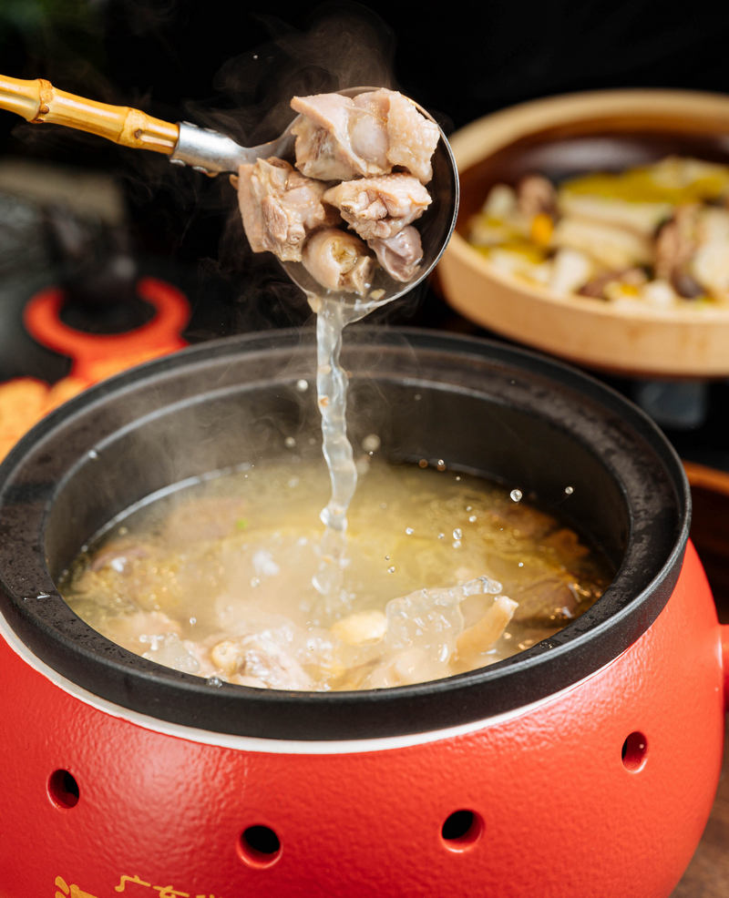 以雞為主要烹飪食材,洞庭土雞館的湖南師傅創(chuàng)造出了不一樣的菜肴。每桌食客坐下,都少不得一碗暖乎乎的洞庭土雞湯來“開場”。它的登場也相當(dāng)有氣勢,長沙紅磚窯特別定制的大湯鍋,內(nèi)膽是紫砂構(gòu)造,這樣的設(shè)計既是出于美觀,又是出于更長時間更有效保溫的效果。俗話說得好,工欲善其事必先利其器。土雞方面,師傅特別精選了湖南竹山雞,肉質(zhì)的彈性略勝一籌,據(jù)介紹,竹山雞的養(yǎng)殖戶開放了大片山頭讓雞跑,放養(yǎng)時間足夠長,達(dá)到一年多,在如今快節(jié)奏的社會里已實屬難得。老雞加山泉水文火熬3個小時,并沒有其他的味道干擾,簡簡單單就是本味。