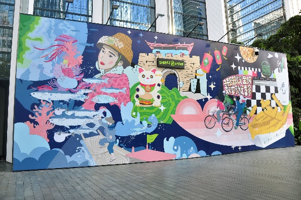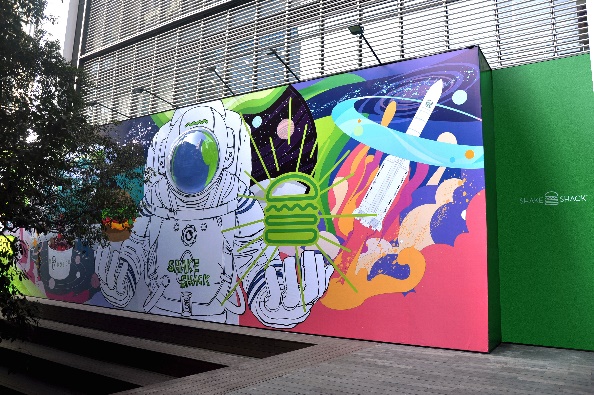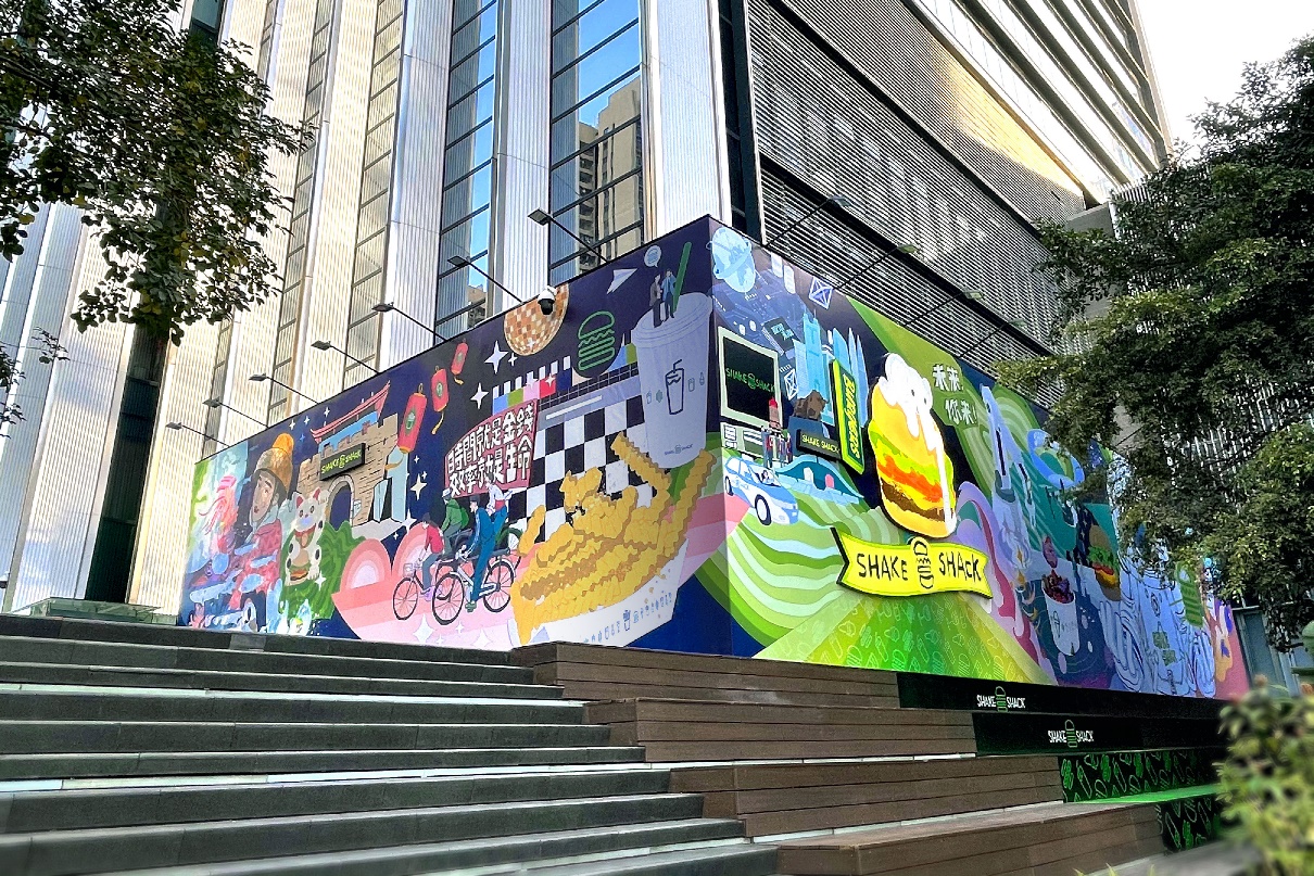 Shake Shack一直熱衷于將品牌文化、潮流趨勢與當?shù)厣罘绞较嗳诤希瑸槠放茙砣蚂`感。作為深圳首店正式開業(yè)前的預告,Shake Shack攜手深圳先鋒藝術(shù)家李昱昱 ? (Y oyo L ee )在深圳萬象天地特別推出了別具匠心且富有致敬意義的巨幅創(chuàng)意圍擋。