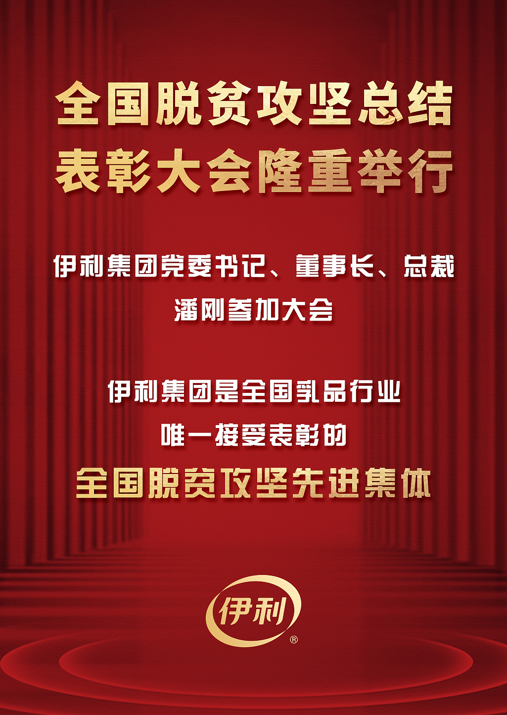 2月25日,全國脫貧攻堅(jiān)總結(jié)表彰大會(huì)在北京隆重舉行。伊利集團(tuán)是乳品行業(yè)全國脫貧攻堅(jiān)先進(jìn)集體唯一獲獎(jiǎng)企業(yè)。