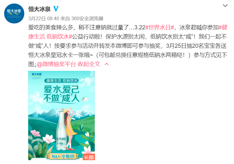 見圳客戶端·深圳新聞網(wǎng)2021年3月30日訊 (記者 常軍平)目前正值3月22日第二十九屆“世界水日”以及3月22—28日第三十四屆“中國水周”之際,恒大冰泉天然低鈉礦泉水深入洞察借勢,發(fā)起以不做“咸”人為主題的公益活動,引發(fā)了全網(wǎng)的關(guān)注熱議和積極參與,刷屏社交媒體,成為新的公益“爆款”。