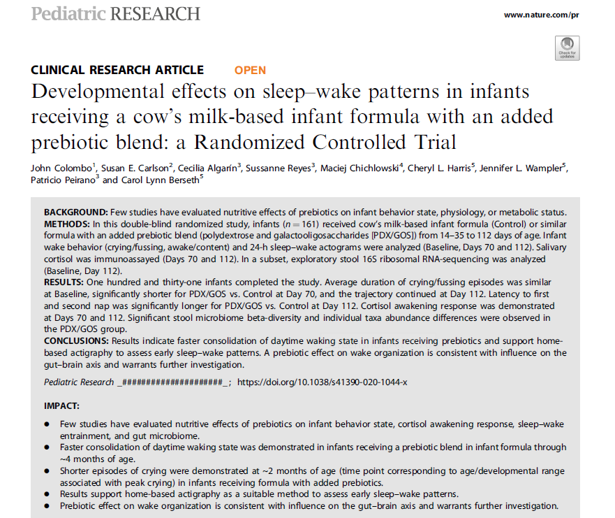 近日,一篇臨床研究揭示了寶寶腸道營養(yǎng)與睡眠間的關(guān)聯(lián)。據(jù)悉,這項(xiàng)研究于2014年啟動,是全球首個(gè)探究 PDX+GOS益生元組合配方奶粉與寶寶睡眠模式養(yǎng)成關(guān)系的雙盲隨機(jī)對照試驗(yàn)。研究由美國堪薩斯大學(xué)壽命研究所John Colombo教授牽頭,美國堪薩斯大學(xué)醫(yī)學(xué)中心營養(yǎng)學(xué)系、智利大學(xué)營養(yǎng)與食品技術(shù)研究所睡眠與功能性神經(jīng)生物學(xué)實(shí)驗(yàn)室等多個(gè)國際知名研究機(jī)構(gòu)共同參與。這項(xiàng)研究在經(jīng)研究同行的層層學(xué)術(shù)審評后,近日于《兒科研究》上正式發(fā)表,成果獲得科學(xué)界認(rèn)可。