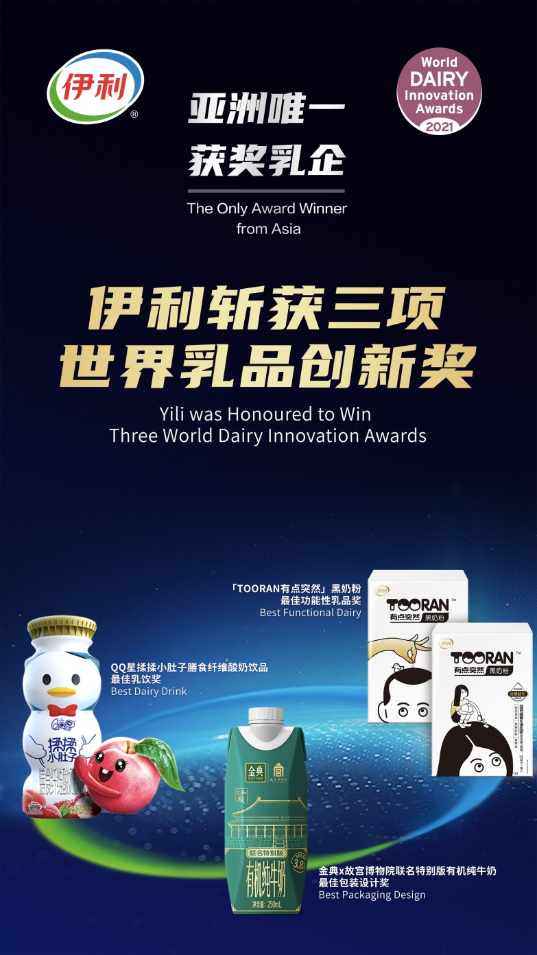作為全球乳業(yè)的創(chuàng)新風向標,世界乳品創(chuàng)新獎展示了全球乳企在創(chuàng)新方面取得的重要成果,本屆共有來自25個國家、20個類別的222個作品參賽。憑借領先的創(chuàng)新實力,伊利旗下產品獲得三項大獎:QQ星揉揉小肚子膳食纖維酸奶飲品獲得最佳乳飲獎、「TOORAN有點突然」黑奶粉獲得最佳功能性乳品獎、金典x故宮博物院聯(lián)名特別版有機純牛奶獲得最佳包裝設計獎。