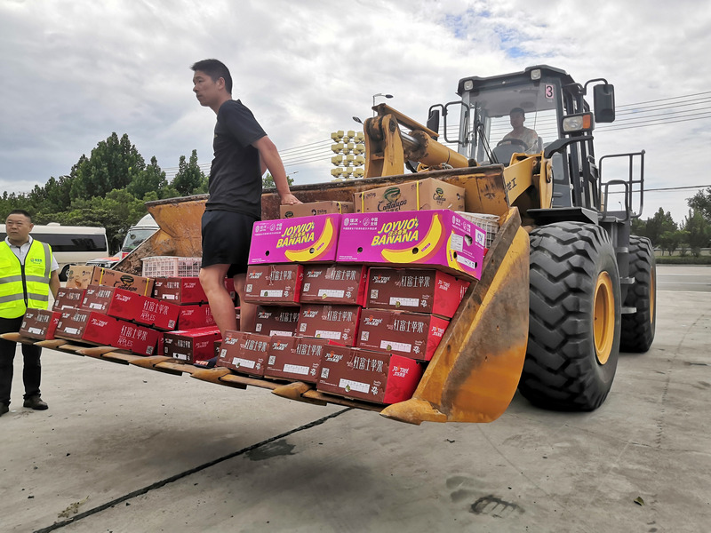 鏟車接力運送賑災愛心水果。