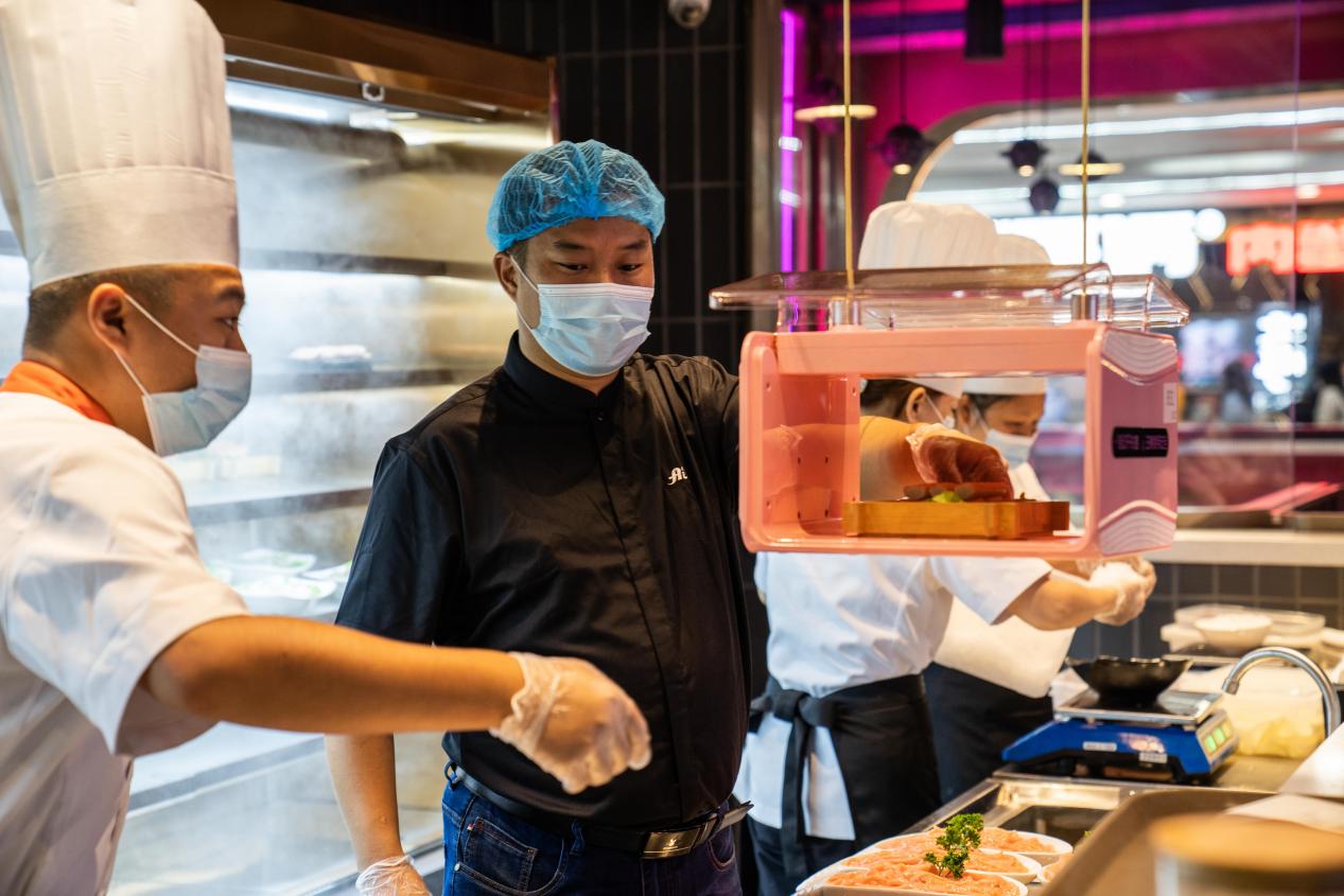 值得一提的是,除了地道的火鍋美食,這家餐廳的特別之處,在于高科技智能機器人的廣泛應(yīng)用。在餐廳過道里,一款名為“蠶豆”的配送機器人來回奔忙,把各式菜品有條不紊地送達(dá)顧客桌前。半空中,高效穿梭的云軌小車將菜品傳送到餐桌,“從天而降”呈現(xiàn)在顧客面前,科技體驗感十足。這款“天降”智能云軌傳輸系統(tǒng),由智能配餐、智能云軌兩大模塊構(gòu)成。顧客通過手機下單后,智能配餐系統(tǒng)接到指令,能自動將相應(yīng)菜品餐食分配給云軌小車,高效、快速地配送到對應(yīng)餐桌,整個送餐過程實現(xiàn)“零接觸”,在高效率的同時,確保了安全衛(wèi)生。
