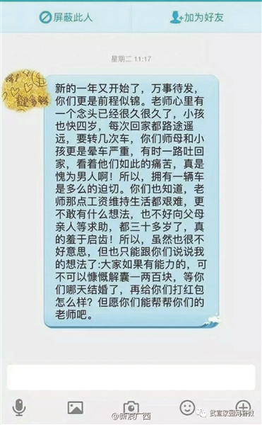 爆料帖中同時上傳了多張聊天記錄,其中一張顯示:“新的一年又開始了,萬事待發(fā),你們更是前程似錦。老師心里有個念頭已經(jīng)很久了,小孩也快四歲了,每次回家都路途遙遠(yuǎn),要轉(zhuǎn)幾次車,你們師母和小孩更是暈車嚴(yán)重,有時一路吐回家,看看他們?nèi)绱送纯啵媸抢槟腥税。∷?,擁有一輛車是多么的迫切。你們也知道老師那些工資維持生活都很艱難,更不敢有什么想法,也不好向父母親人求助,都三十多歲了,真的羞于啟齒!所以,雖然也很不好意思,但是也只能跟你們說說我的想法了:大家如果有能力的,可不可以慷慨解囊一兩百塊,等你們哪天結(jié)婚了,再給你們打紅包怎么樣?但愿你們能幫幫你們的老師吧?!?/p>