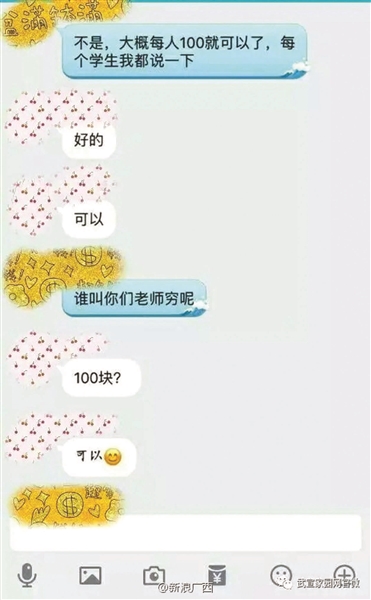 在被曝光的聊天記錄中,該老師曾表示,“大概每人100就可以了,每個學(xué)生我都說一下?!辈⒔忉屨f,“誰叫你們老師窮呢?”聊天記錄顯示,群內(nèi)多名學(xué)生回復(fù)稱,“可以。”