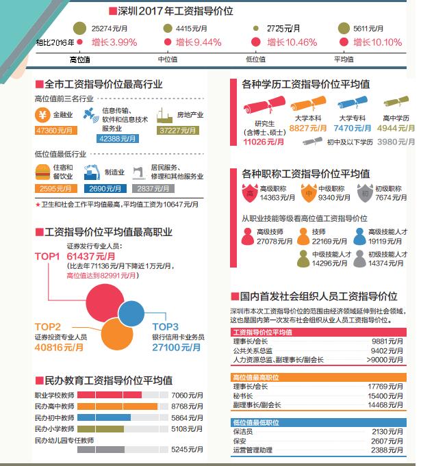 深圳哪些行業(yè)最有“錢途”?哪個(gè)職業(yè)最吸金?9月18日,由深圳市人社局發(fā)布的《2017年深圳市人力資源市場(chǎng)工資指導(dǎo)價(jià)位》顯示,2017年,深圳工資指導(dǎo)價(jià)位平均值為5611元/月,比去年上漲10.10%。在508個(gè)職業(yè)中,證券發(fā)行專業(yè)人員依然最吸金,工資指導(dǎo)價(jià)位平均值為61437元/月。此外,深圳今年還首次發(fā)布社會(huì)組織從業(yè)人員工資指導(dǎo)價(jià)位。