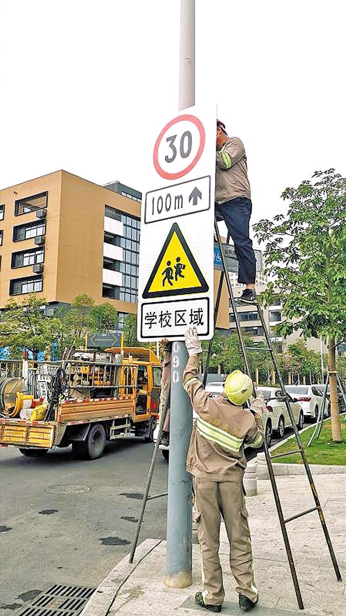 交通設施維護工人在龍華區(qū)龍騰學校周邊道路安裝提示牌。