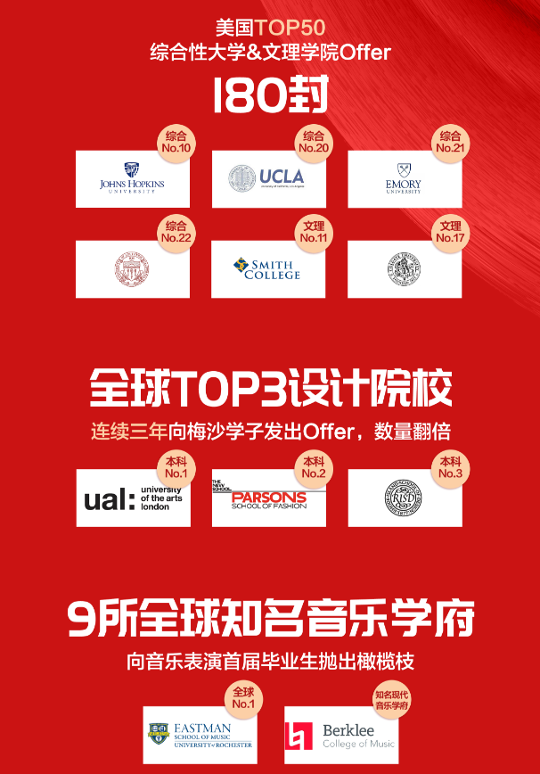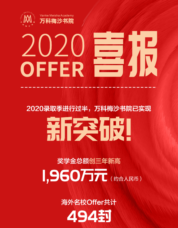 2020申請季還未結(jié)束,梅沙學(xué)子已收獲494封海外名校錄取Offer,獎(jiǎng)學(xué)金累計(jì)約合人民幣1,960萬元,創(chuàng)三年新高。其中,來自美國Top100綜合性大學(xué)及文理學(xué)院的錄取通知書有356份,來自美國Top50綜合性大學(xué)及文理學(xué)院的錄取通知書有180份。