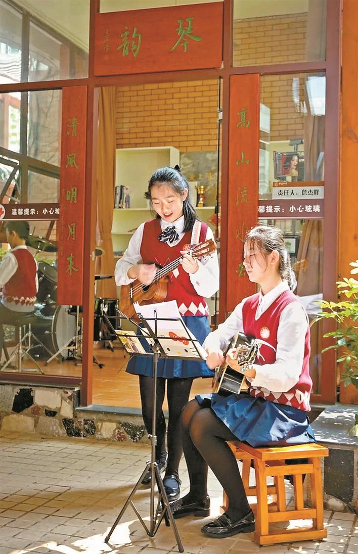 校園一角的“樂·舞臺(tái)”上擺放著一架鋼琴,陳鐵成校長(zhǎng)說:“在沒有疫情的時(shí)候,這架鋼琴是不上鎖的,任何老師或?qū)W生都可以彈奏。同樣開放的還有琴韻閣、清心閣,不要擔(dān)心學(xué)生會(huì)破壞這些東西,美自然地呈現(xiàn)在學(xué)生們面前,自然地發(fā)生,真正的教育就是在這樣的情境中發(fā)生的?!?/p>