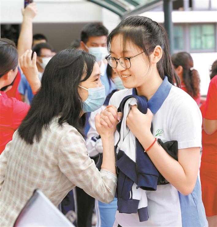 準(zhǔn)備進(jìn)入考場的育才中學(xué)考生與老師微笑握手,帶著老師的美好祝愿自信面對人生大考。深圳特區(qū)報記者周紅聲攝