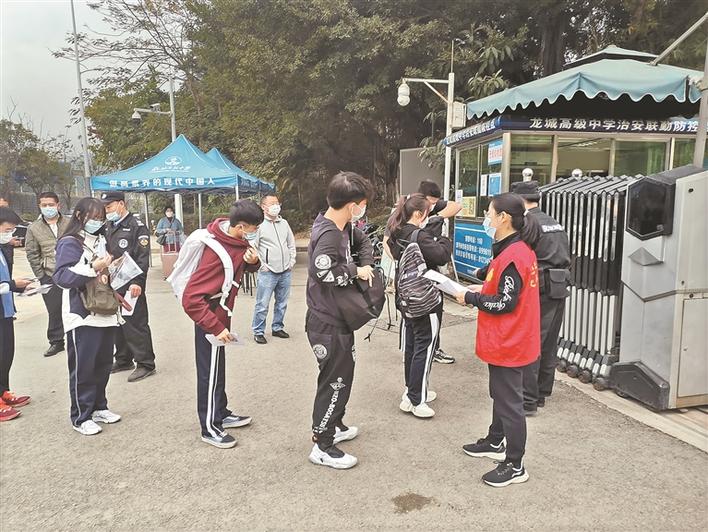 龍高黨員志愿者考前在校門口檢測學(xué)生體溫。