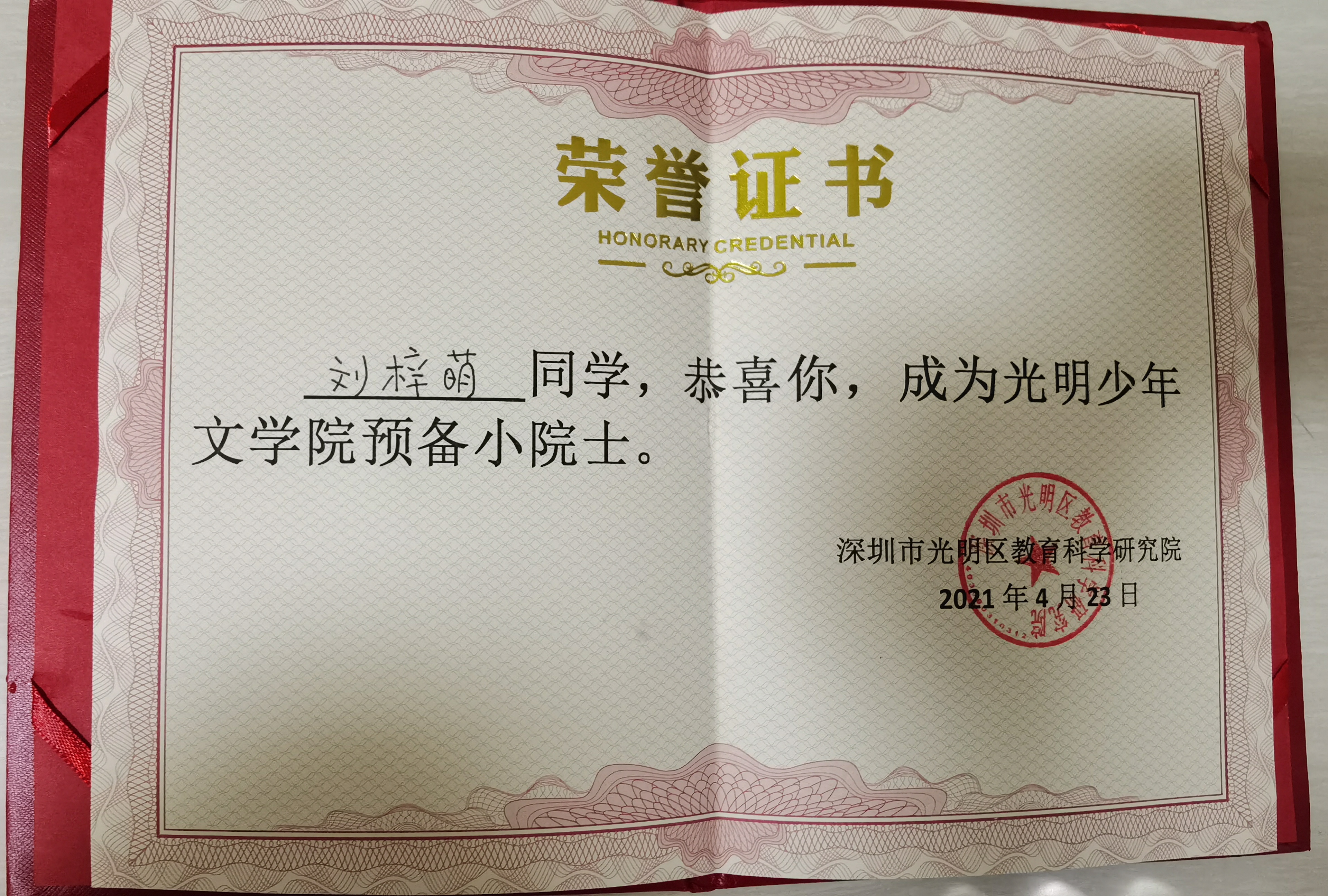 在光明區(qū)少年文學(xué)院評選中,學(xué)校獲批成立“光明區(qū)少年文學(xué)院分院”,陳沐文老師擔(dān)任文學(xué)院期刊編輯,方汶琪、劉梓萌、吳青華三位同學(xué)被授予“預(yù)備小院士”稱號。