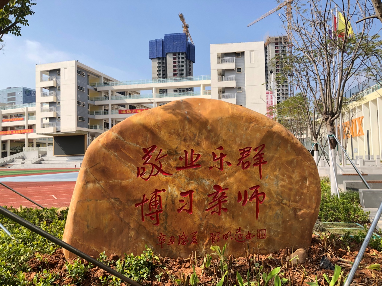 2021年底,學校啟用新東門,門右側墻壁上則是神采奕奕的校名:深圳市光明區(qū)鳳凰學校。經(jīng)東門而入校園,呈現(xiàn)在眼前的是一塊碩大刻石,其辭曰:敬業(yè)樂群,博習親師。