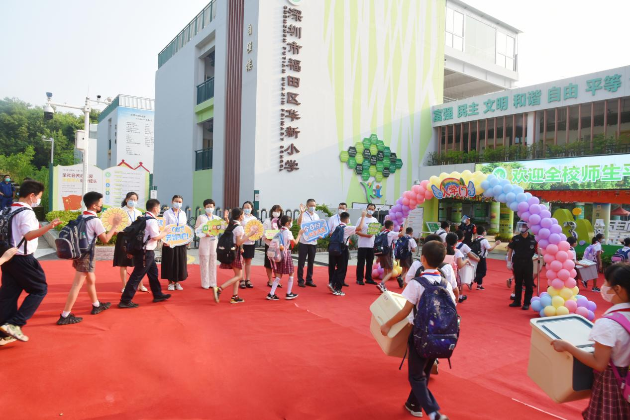 “同學(xué)們好!歡迎你們回家!”9月20日一早,華新小學(xué)校長張偉帶領(lǐng)老師們、家長義工們在校門口迎候四至六年級(jí)學(xué)生返校。同學(xué)們背著書包,抱著午托箱,迎著朝陽,踏著紅毯意氣風(fēng)發(fā)走進(jìn)“入學(xué)門”。校領(lǐng)導(dǎo)、老師和家長義工們熱情迎接同學(xué)們平安返校,學(xué)生們從此告別漫長的暑假,開啟新學(xué)期的校園學(xué)習(xí)生活。