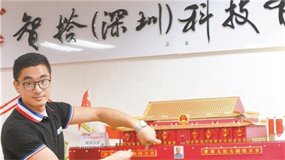 在8平方米的展臺(tái)上,1.2米寬、1米左右高的天安門雄壯威武,護(hù)旗手、閱兵戰(zhàn)士、坦克、裝甲車、吉普車、升旗臺(tái)等一應(yīng)俱全、栩栩如生