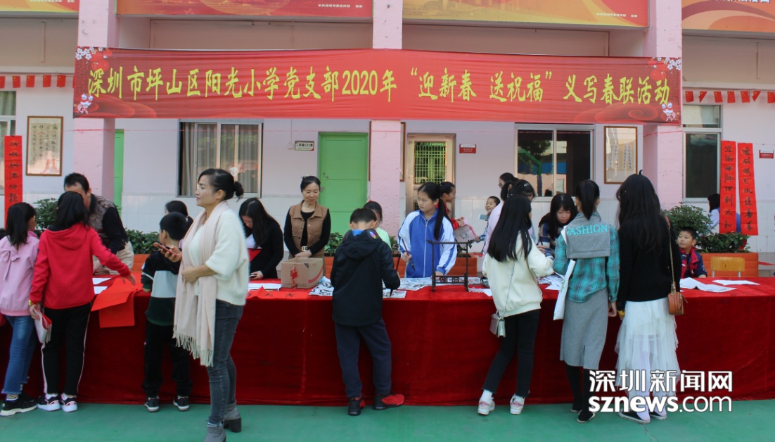近日,深圳市坪山區(qū)陽(yáng)光小學(xué)開展“迎新春 送祝?!绷x寫春聯(lián)活動(dòng),老師們現(xiàn)場(chǎng)揮毫?xí)鴮懸桓备痹⒁庑麓鹤85拇郝?lián),為社區(qū)居民、家長(zhǎng)奉上美好祝愿。
