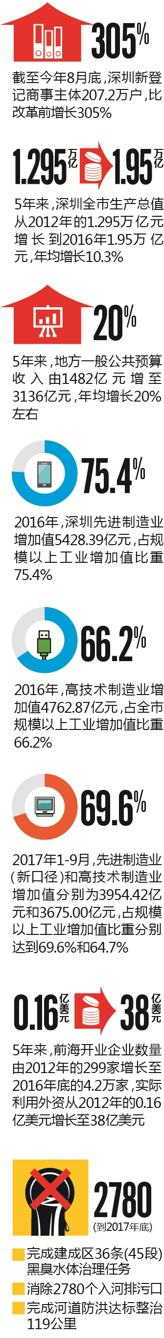 在創(chuàng)新驅動發(fā)展戰(zhàn)略推動下,深圳“大眾創(chuàng)業(yè)萬眾創(chuàng)新”蓬勃發(fā)展,中外創(chuàng)客匯聚于此。人才與創(chuàng)新為深圳經濟社會發(fā)展提供源源不斷的活力和潛力。5年來,深圳全市生產總值從2012年的1.295萬億元增長到2016年1.95萬億元,年均增長10.3%;地方一般公共預算收入由1482億元增至3136億元,年均增長20%左右。