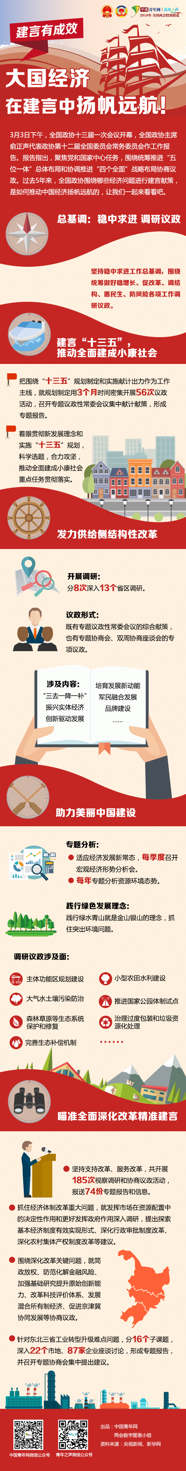 中國(guó)青年網(wǎng)北京3月4日電 3月3日下午,全國(guó)政協(xié)十三屆一次會(huì)議開(kāi)幕,全國(guó)政協(xié)主席俞正聲代表政協(xié)第十二屆全國(guó)委員會(huì)常務(wù)委員會(huì)作工作報(bào)告。報(bào)告指出,聚焦黨和國(guó)家中心任務(wù),圍繞統(tǒng)籌推進(jìn)“五位一體”總體布局和協(xié)調(diào)推進(jìn)“四個(gè)全面”戰(zhàn)略布局協(xié)商議政。過(guò)去5年來(lái),全國(guó)政協(xié)圍繞哪些經(jīng)濟(jì)問(wèn)題進(jìn)行建言獻(xiàn)策,是如何推動(dòng)中國(guó)經(jīng)濟(jì)揚(yáng)帆遠(yuǎn)航的,讓我們一起來(lái)看看吧。