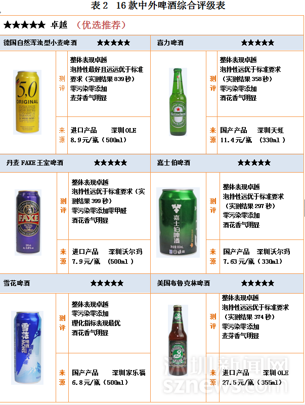 16款中外啤酒中,6款評級五星,國產(chǎn)與進(jìn)口各3款,分別為:德國自然渾濁型小麥啤酒 、喜力啤酒 、丹麥FAXE王室啤酒 、嘉士伯啤酒、 雪花啤酒、美國布魯克林啤酒。獲得四星評級的有6款,國產(chǎn)5款進(jìn)口1款,4款三星評級均為進(jìn)口啤酒。另外,16款中外啤酒均未出現(xiàn)違規(guī)使用添加劑和污染物超標(biāo)情況,均符合國家食品安全標(biāo)準(zhǔn),甲醛含量均優(yōu)于國標(biāo)要求。