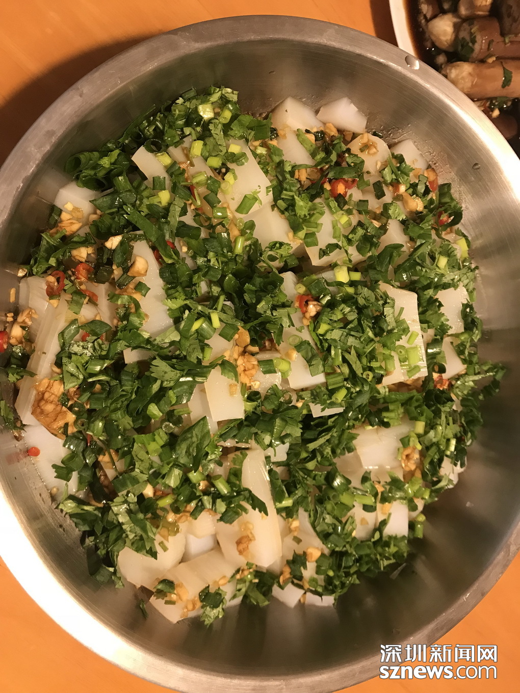 18時左右,各家各戶陸續(xù)端來飯菜:無錫排骨、酸菜炒豬大腸、客家鹽焗雞、紅燒豬腳……品種豐富,幾乎涵蓋中國各大菜系。有熱心人做了統(tǒng)計,一共有67道菜呢!